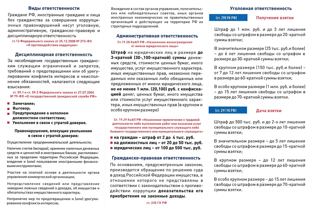 Статьями 13, 14 Федерального закона от 25.12.2008 № 273-ФЗ «О противодействии коррупции» установлено, что граждане Российской Федерации, иностранные граждане и лица без гражданства за совершение коррупционных правонарушений несут уголовную, административную, гражданско-правовую и дисциплинарную ответственность в соответствии с законодательством Российской Федерации.